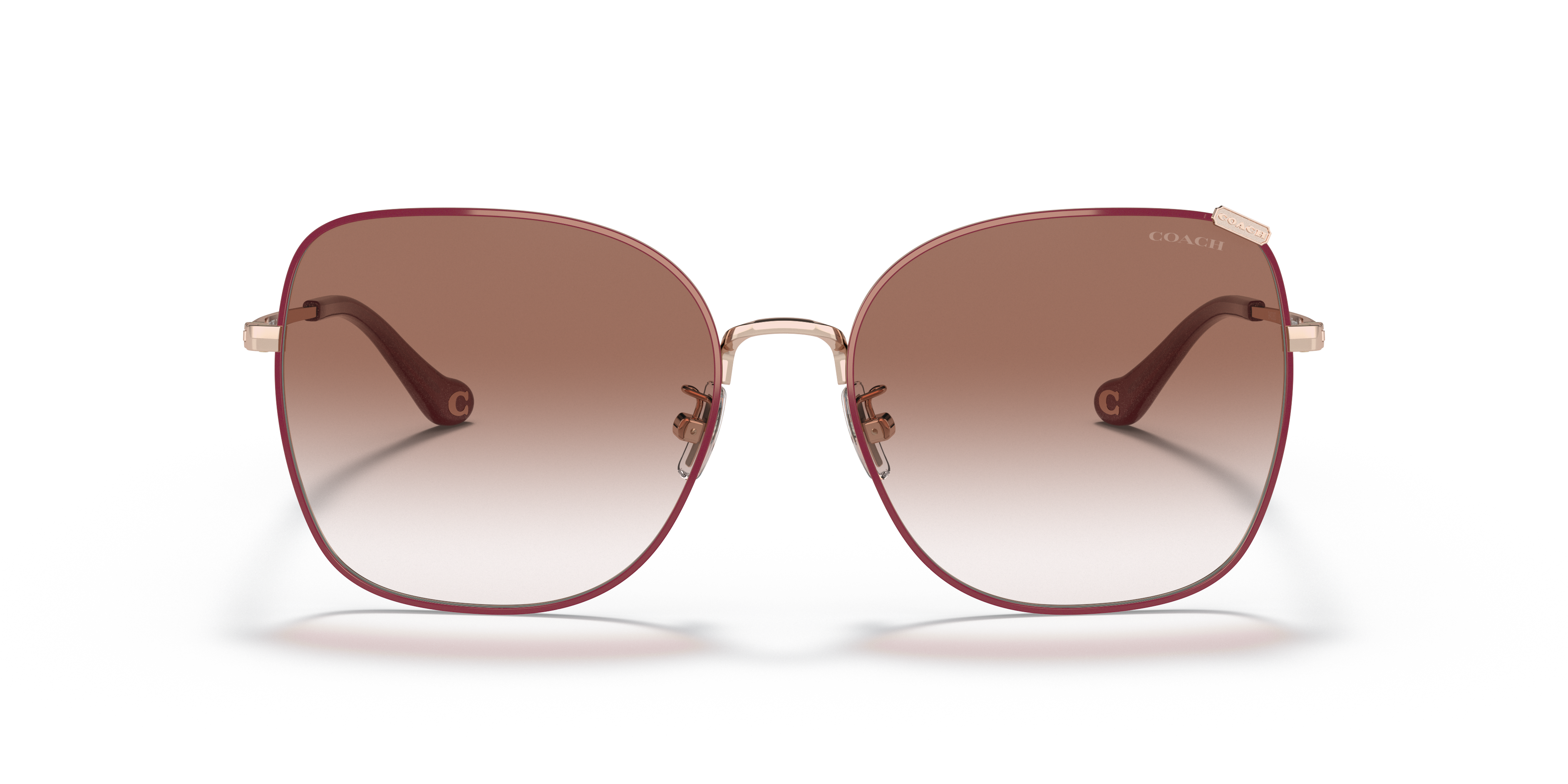 Elevate your look while staying true to your style with Coach C7997 sunglasses. These square-shaped glasses feature a polished, shiny rose gold and burgundy front frame made of durable metal. The lens color is a gradient from burgundy to black, adding a stylish touch to these shades. Whether you're shopping, traveling, or enjoying the outdoors, these sunglasses will keep you looking and feeling fabulous. Available with prescription lenses.