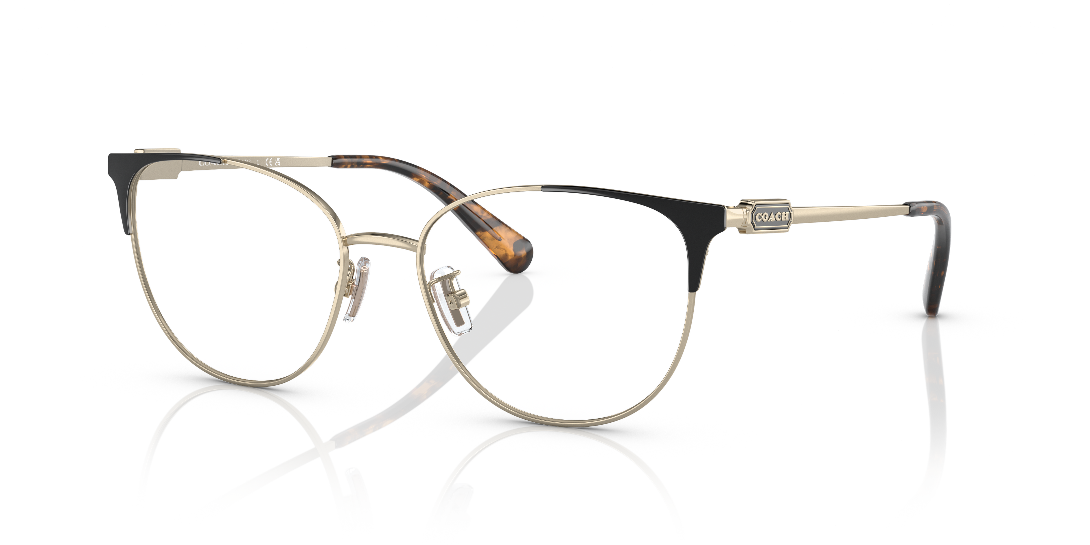 Elevate your fashion and vision standards with Coach HC5148 eyeglasses. The polished metal frame, featuring a cat eye shape, adds a touch of sophistication to any look. The shiny light gold/black color scheme is both timeless and trendy. These glasses are not only stylish but also versatile, making them an ideal accessory for everyday wear. Available with prescription lenses.
