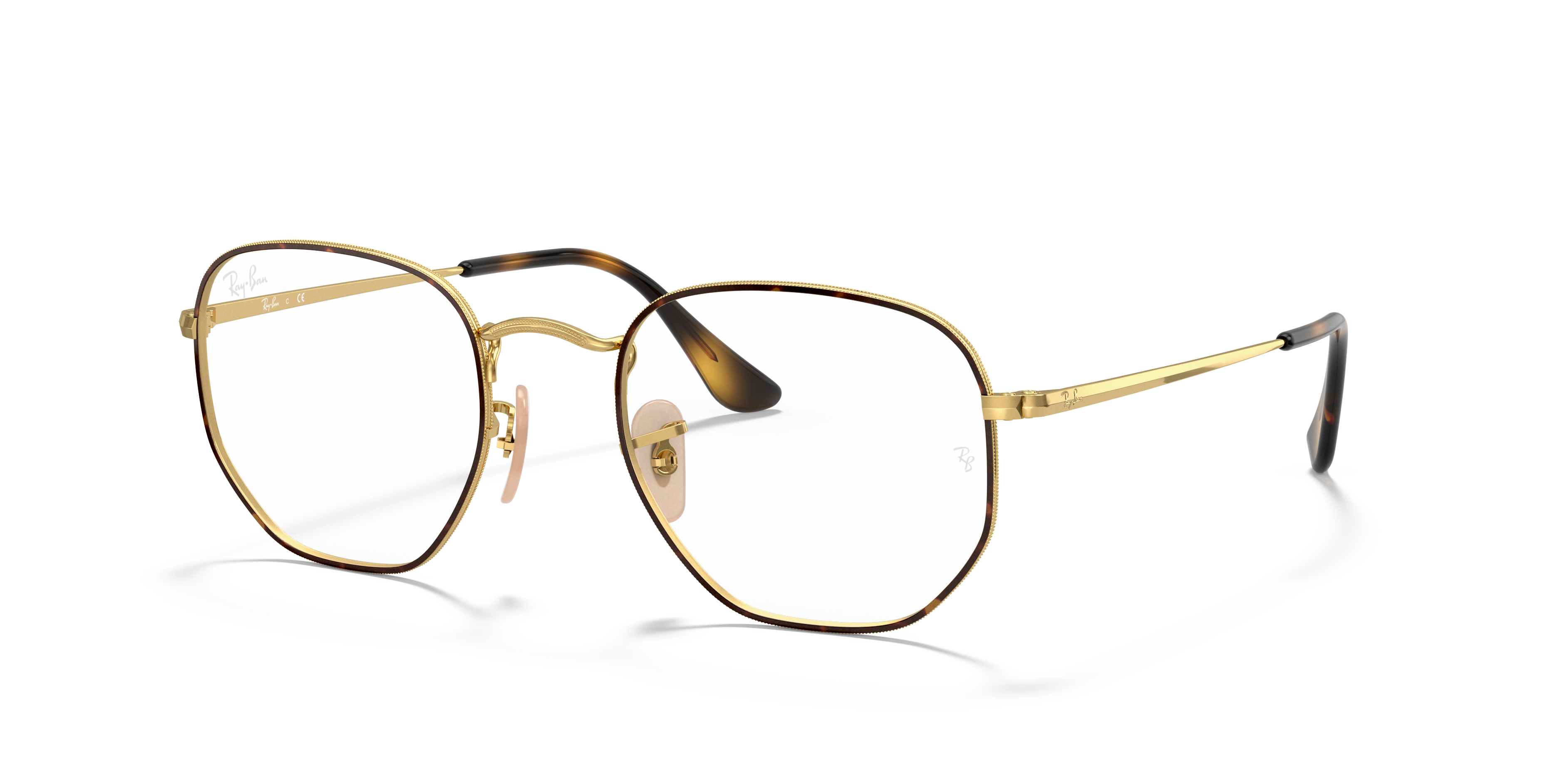 Elevate your look with Ray-Ban Hexagonal Optics. The irregular shape of the metal frame adds a unique touch to your style, while the polished havana on gold color finish provides a sophisticated and modern aesthetic. These eyeglasses are not only stylish but also versatile, making them an ideal choice for everyday wear. Available with prescription lenses.