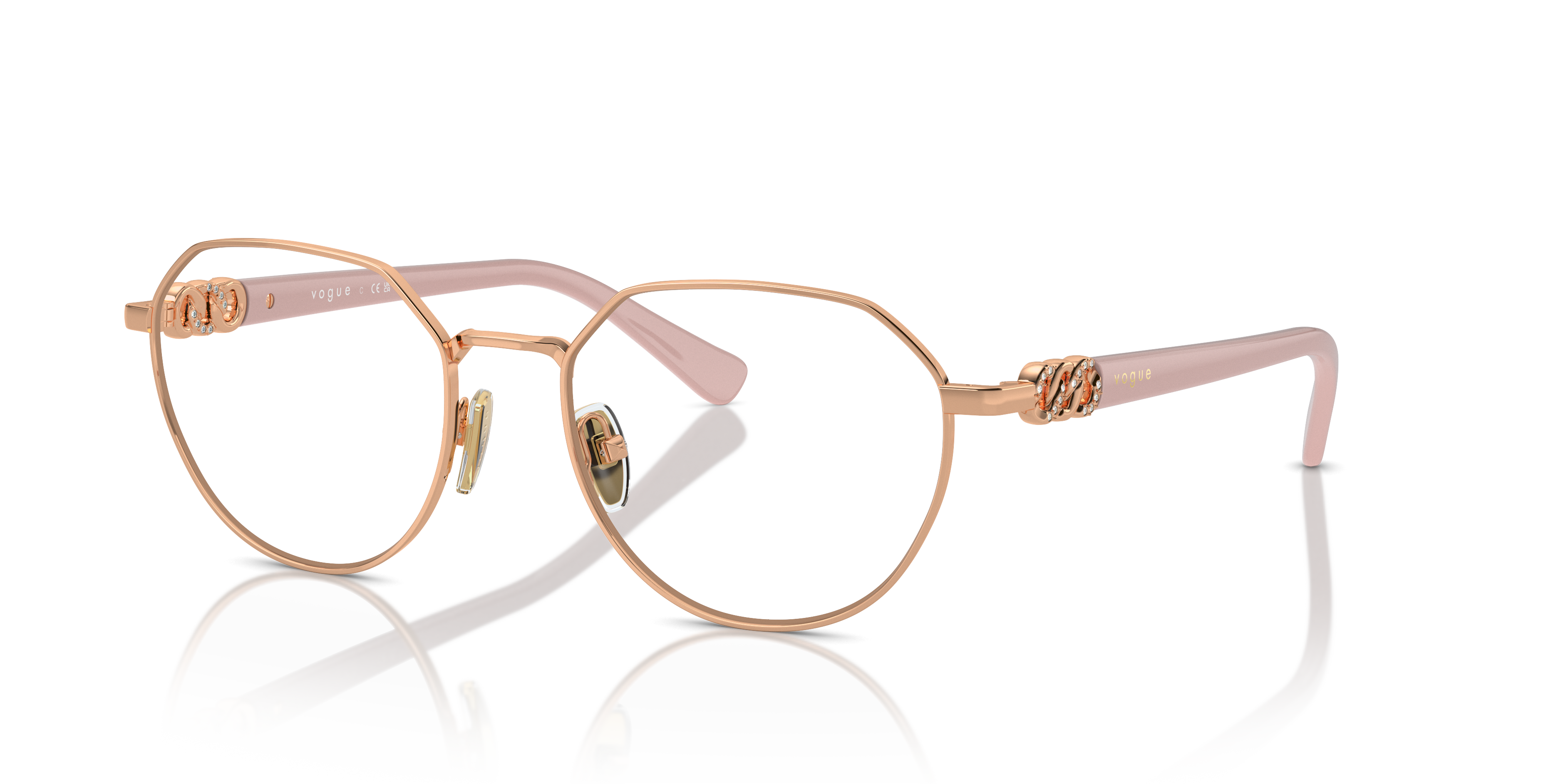 Embrace your individuality with Vogue Eyewear VO4311B optical glasses. The irregular shape of the metal frame, combined with a polished rose gold finish, creates a unique and stylish look. Strass detailing adds a touch of glamour to these frames, making them perfect for those who want to make a fashion statement. These glasses are not just beautiful but also practical, ensuring you can see clearly while staying on trend. Available with prescription lenses.