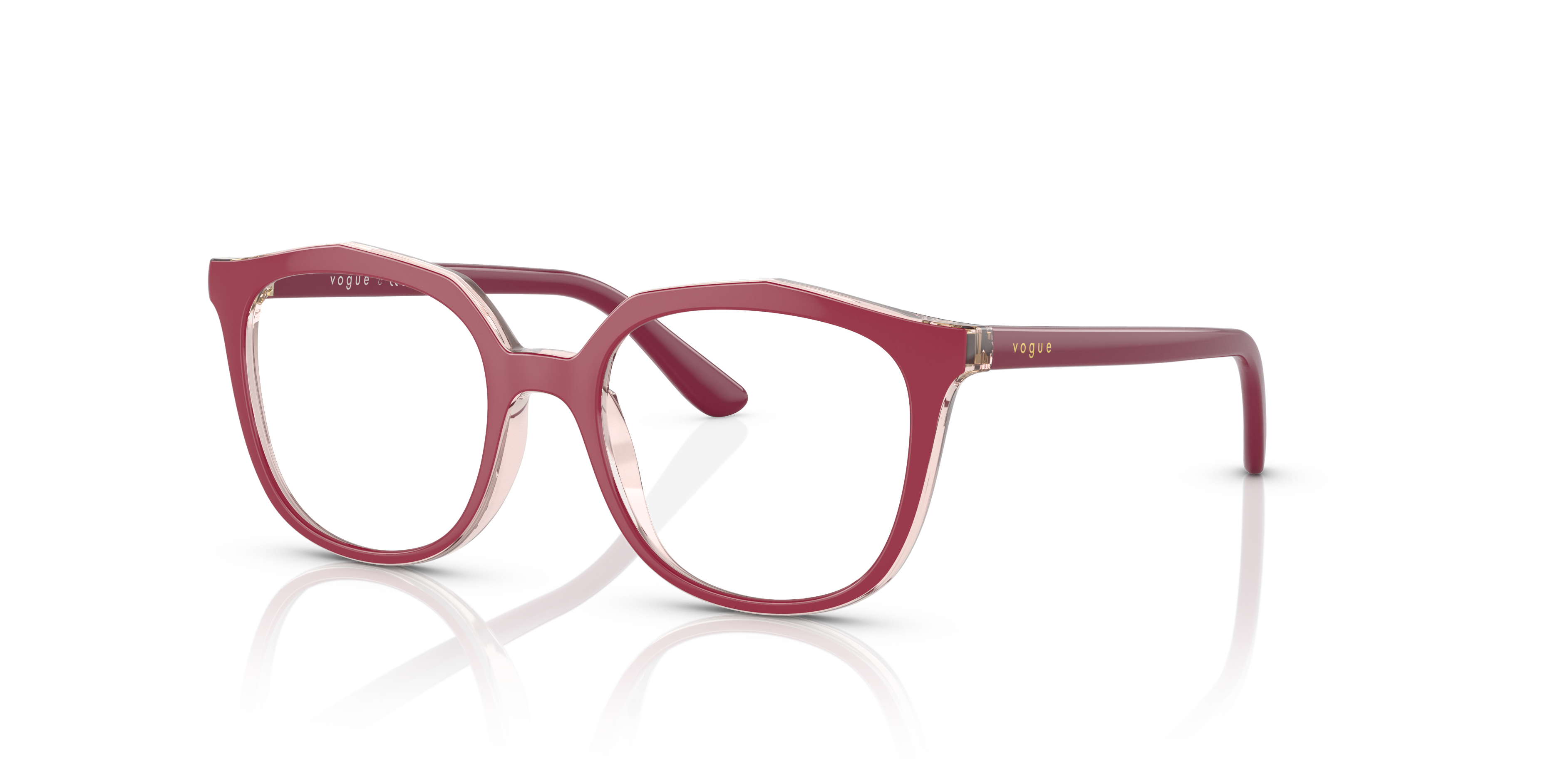 Elevate your child's eyewear experience with Vogue Eyewear VY2017. These glasses feature an irregular shape and a polished, transparent pink/top fuchsia frame that is sure to attract attention. The saddle bridge ensures a comfortable fit while the black temples add a touch of contrast. With these eyeglasses, your little one can enjoy both style and functionality. Available with prescription lenses.