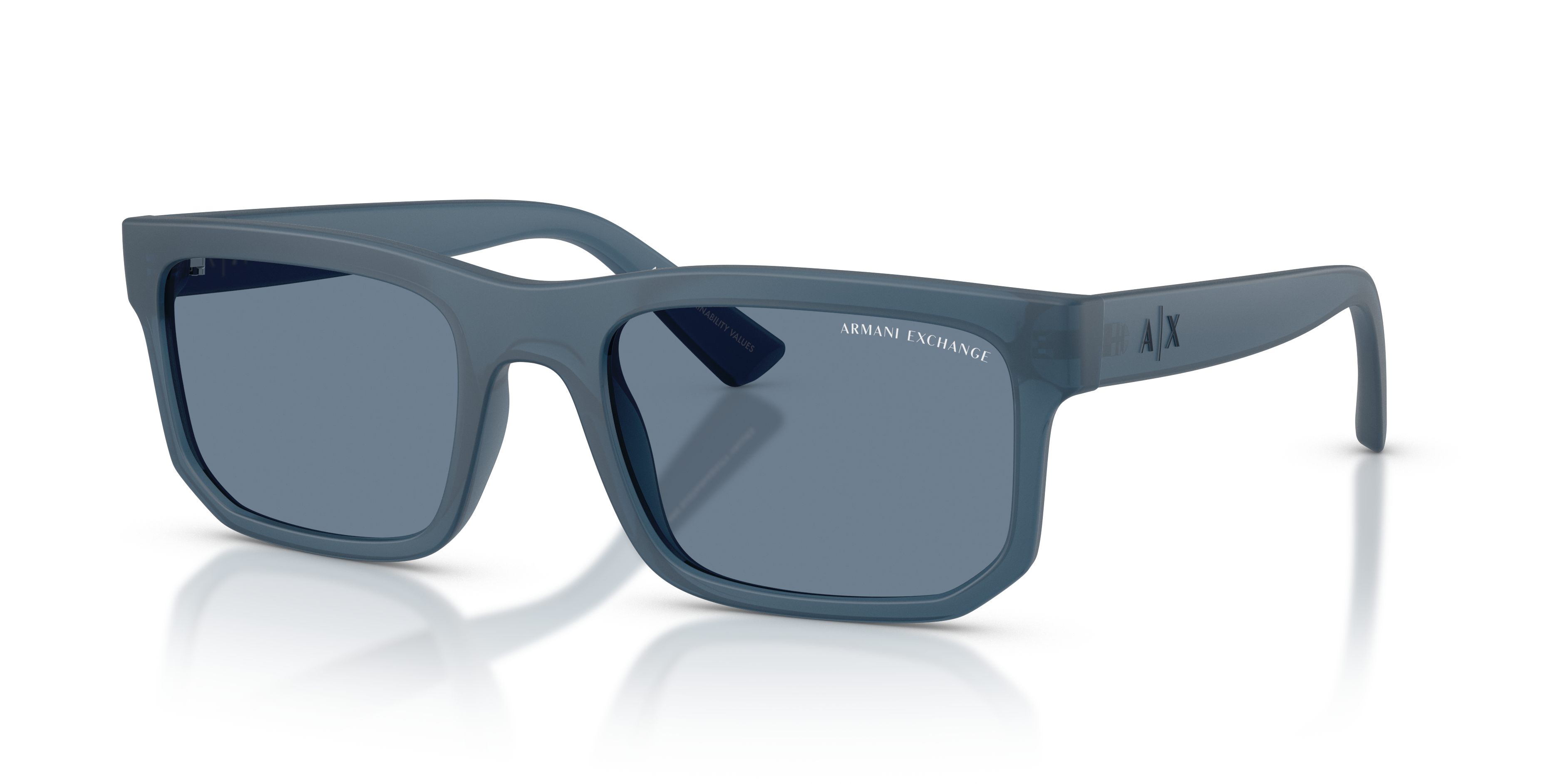 Elevate your style with Armani Exchange AX4165S sunglasses. These square-shaped glasses feature a matte finish for a modern look. The frosted blue frame color is complemented by dark blue polar lenses, adding a touch of sophistication to any outfit. The solid color treatment on the lenses ensures optimal vision and glare reduction, making these shades perfect for everyday wear.