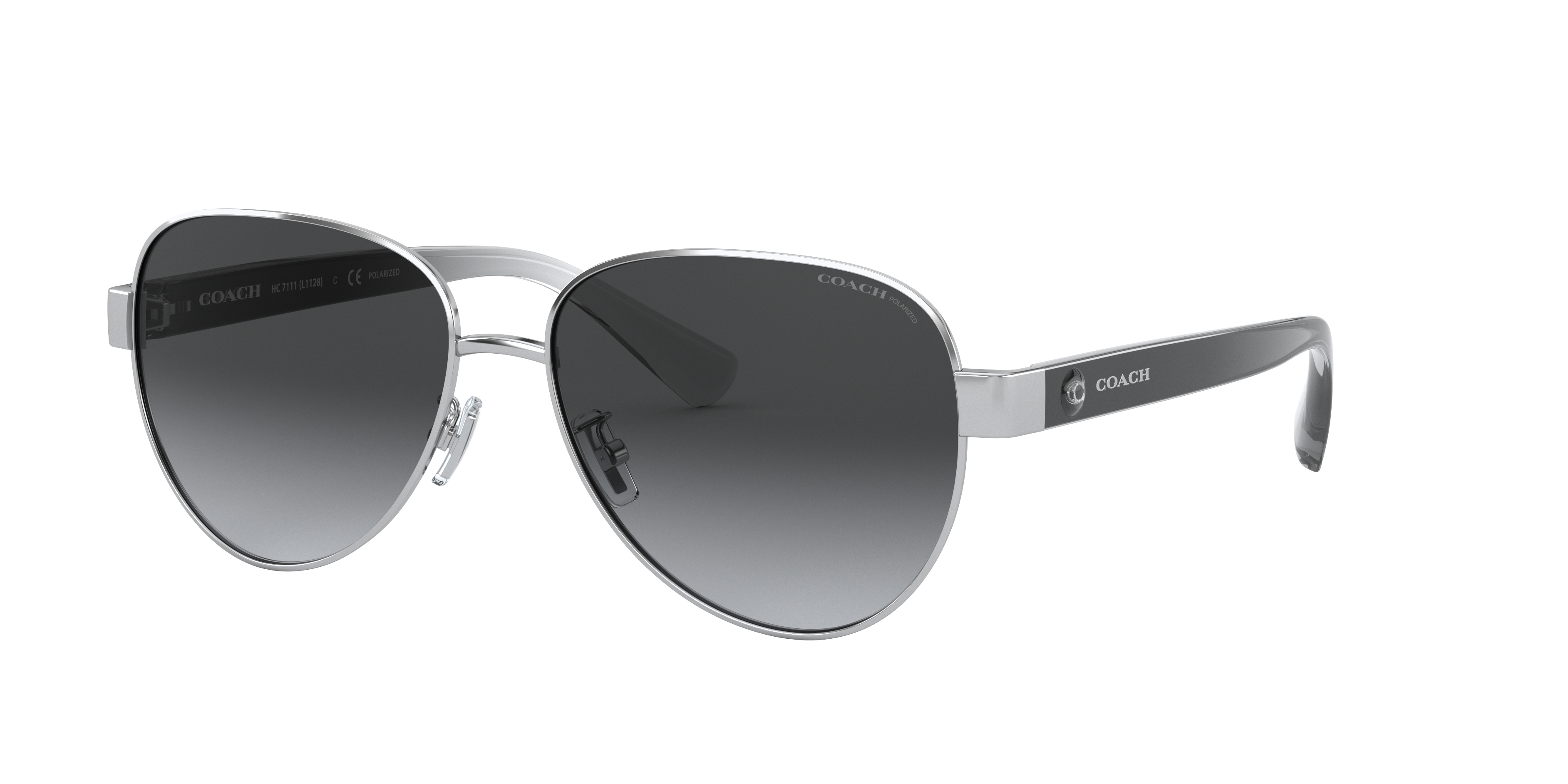 Elevate your style with Coach L1128 sunglasses. The pilot shape and metal frame, in a polished silver finish, exude a timeless appeal. The dark grey gradient polar lenses not only add a touch of sophistication but also provide optimal glare reduction for superior vision clarity. These glasses are not just stylish but also practical. Embrace the effortless elegance of Coach L1128 shades. Available with prescription lenses.