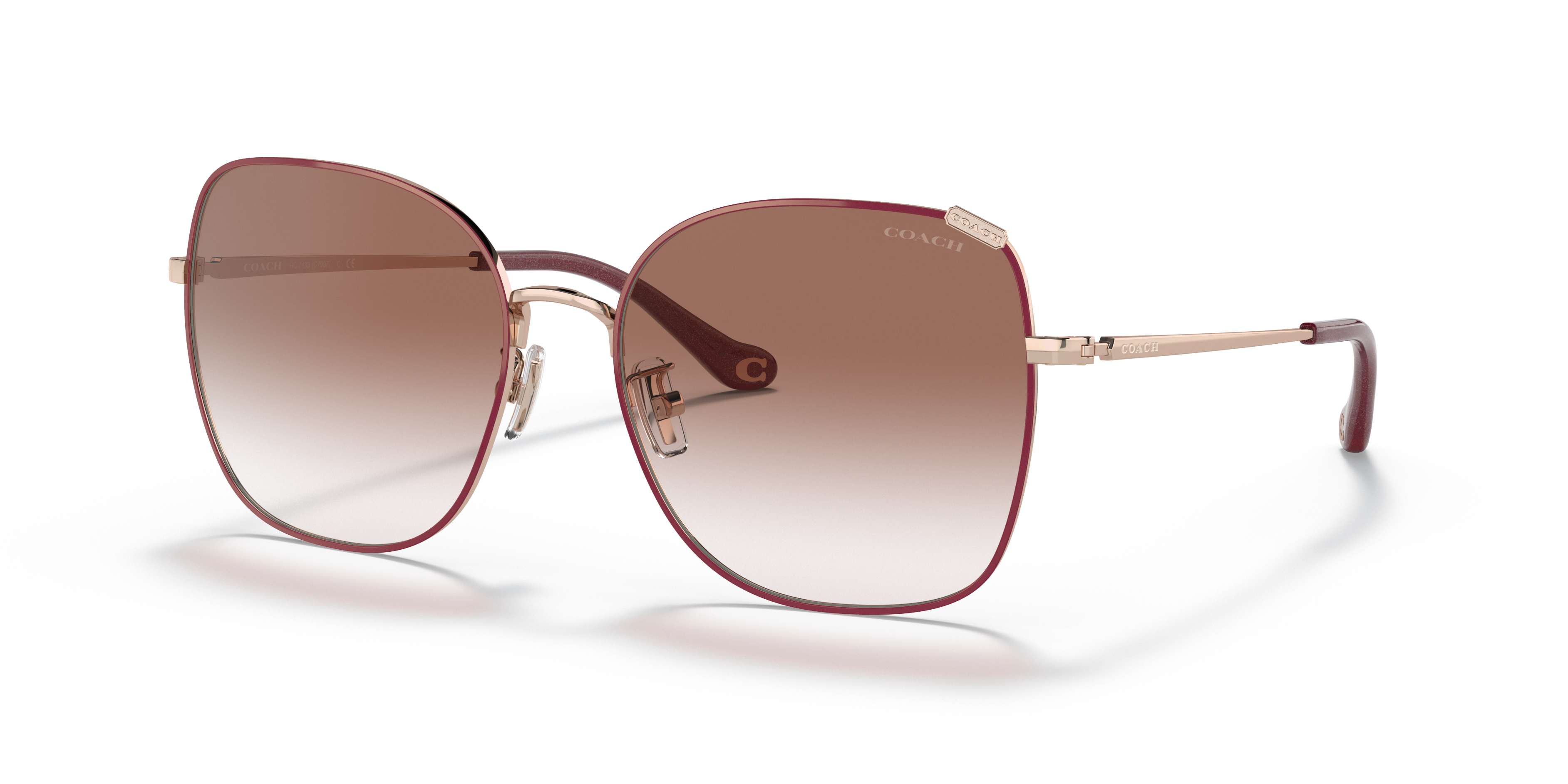 Elevate your look while staying true to your style with Coach C7997 sunglasses. These square-shaped glasses feature a polished, shiny rose gold and burgundy front frame made of durable metal. The lens color is a gradient from burgundy to black, adding a stylish touch to these shades. Whether you're shopping, traveling, or enjoying the outdoors, these sunglasses will keep you looking and feeling fabulous. Available with prescription lenses.