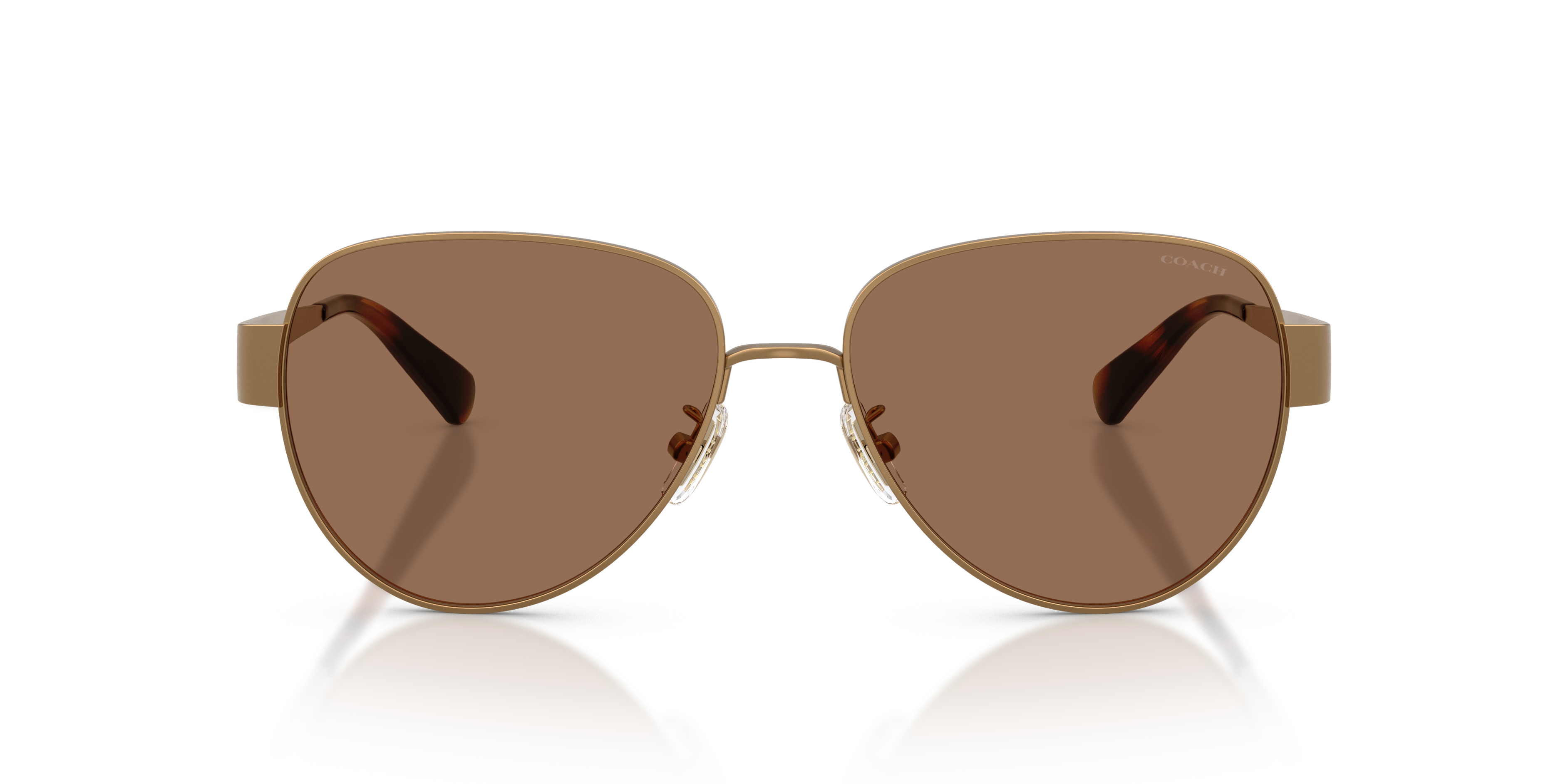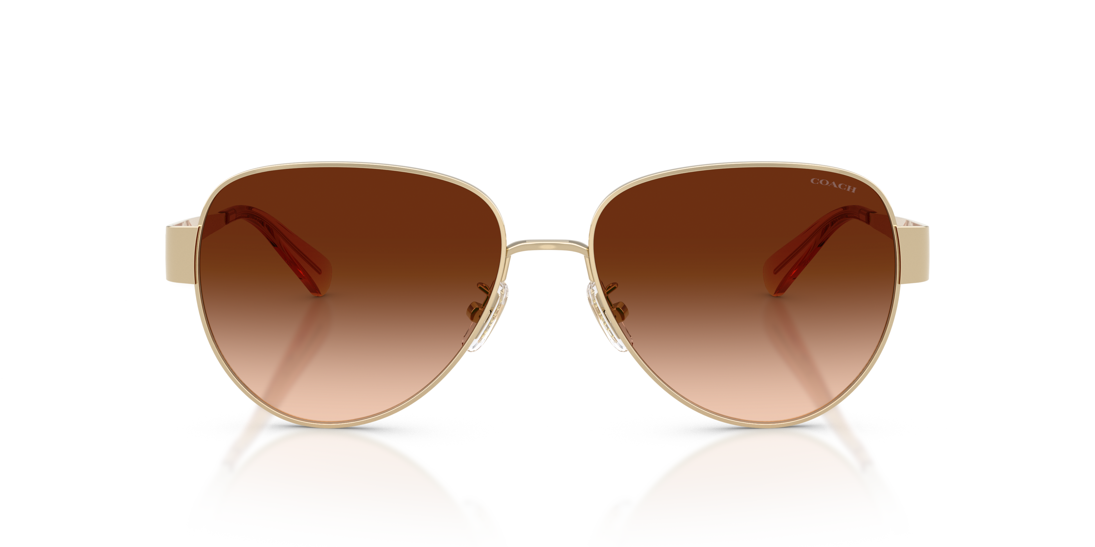 Elevate your style with the Coach HC7186 CDP37 sunglasses. The sleek pilot frames showcase a timeless teardrop shape, crafted from lightweight metal in a shiny light gold finish. Gradient brown lenses enhance the design, while adjustable nosepads sunglasses ensure a comfortable fit. Inspired by the Coach Idol bag, these Coach sunglasses pair luxe details with contemporary flair.