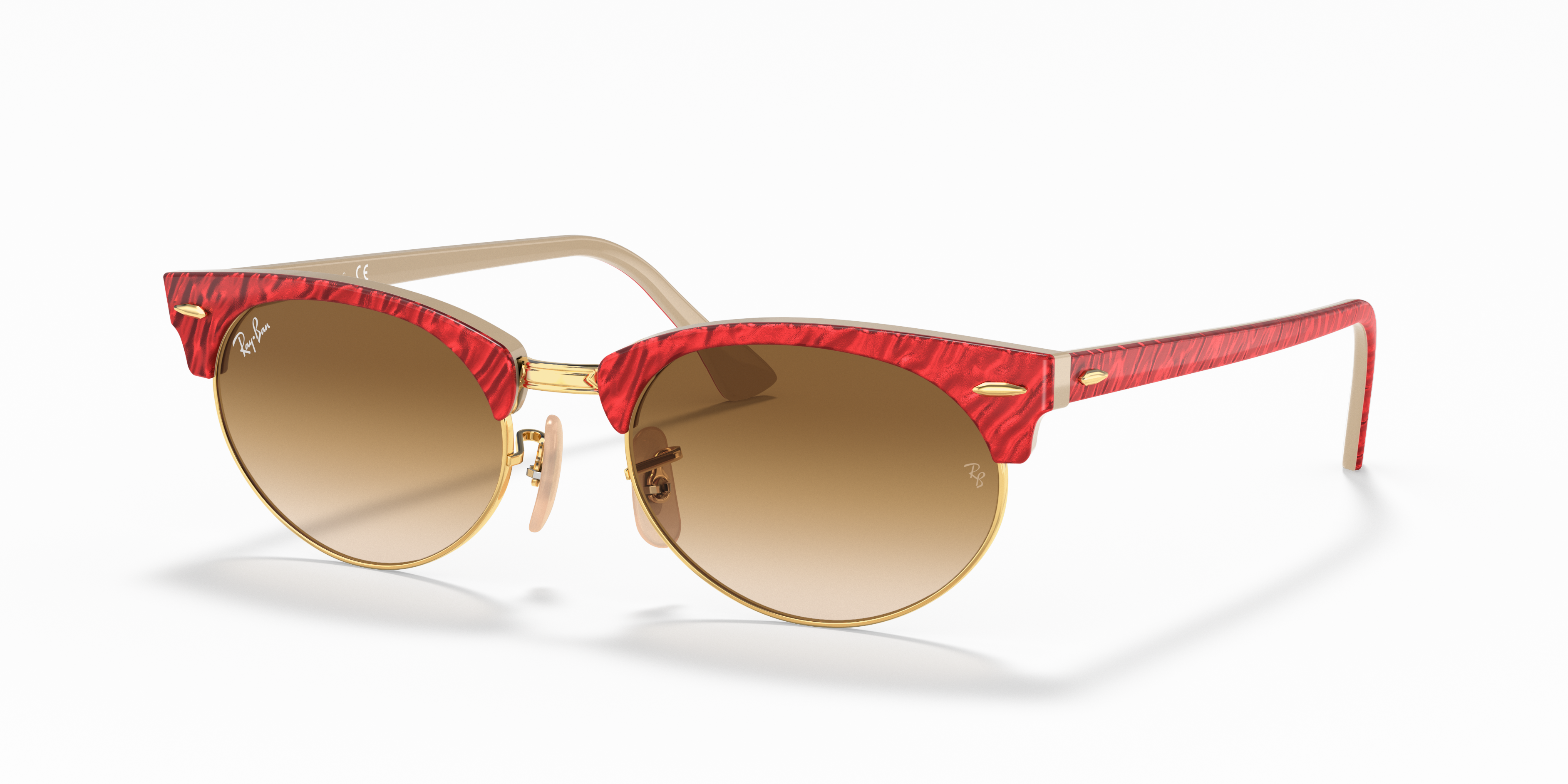 Ray-Ban Clubmaster Oval sunglasses are a modern twist on a retro design. The oval shape adds a touch of sophistication, while the polished red acetate frame provides a vibrant pop of color. The light brown gradient lenses offer a stylish transition from top to bottom, and the black gradient lenses provide enhanced vision in varying light conditions. These shades are not only fashionable but also practical. Available with prescription lenses.