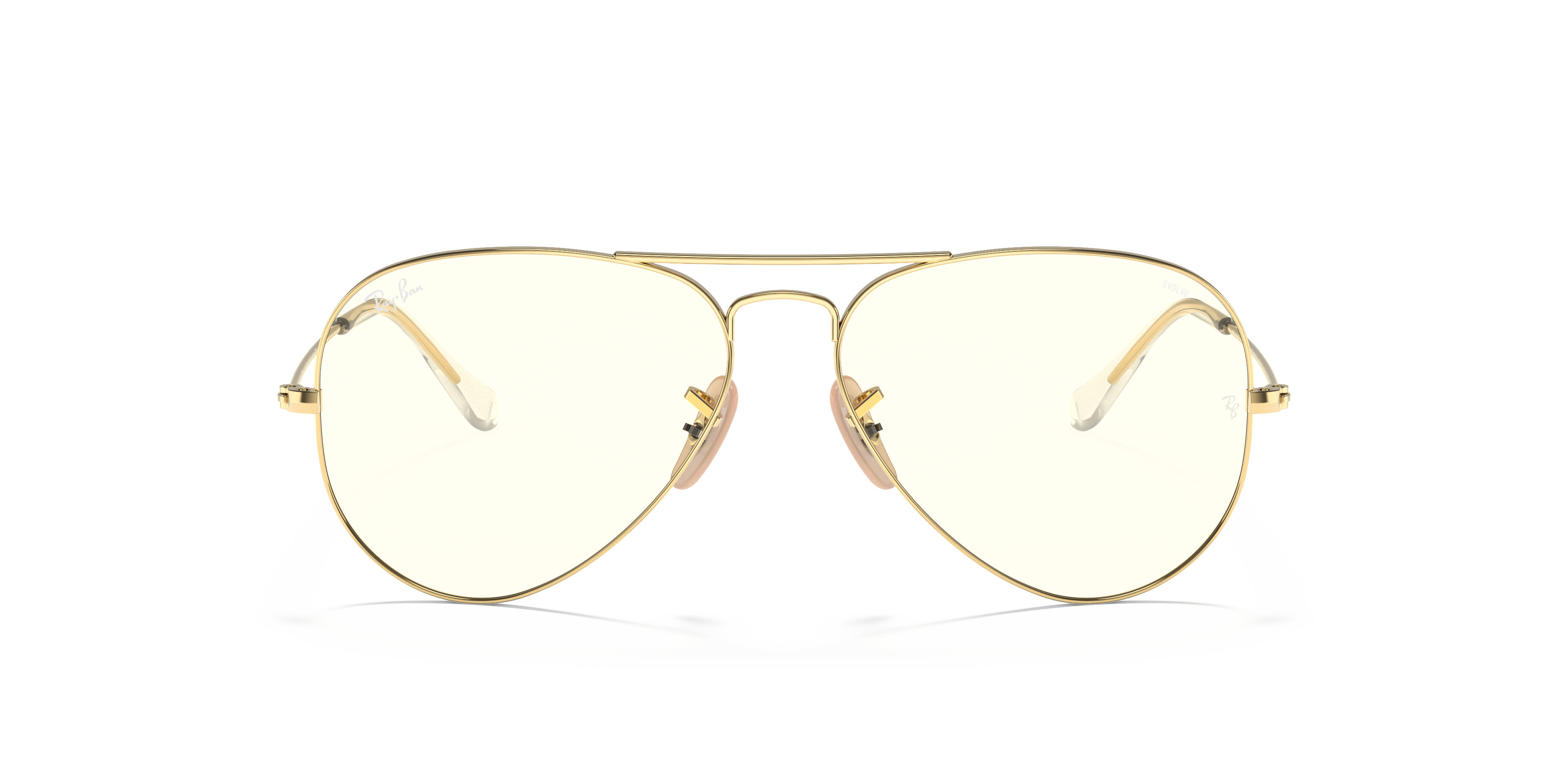 Elevate your style with Ray-Ban Aviator Clear Evolve sunglasses. The pilot shape and gold metal frame, polished to perfection, exude a timeless appeal. These shades feature photo grey lenses that not only offer excellent clarity but also transition seamlessly from dark to light depending on the intensity of sunlight. The unique clear design allows for easy customization, letting you choose your own lens color to match any outfit or mood. Discover the versatility and sophistication of these iconic Ray-Ban Aviator. Available with prescription lenses.