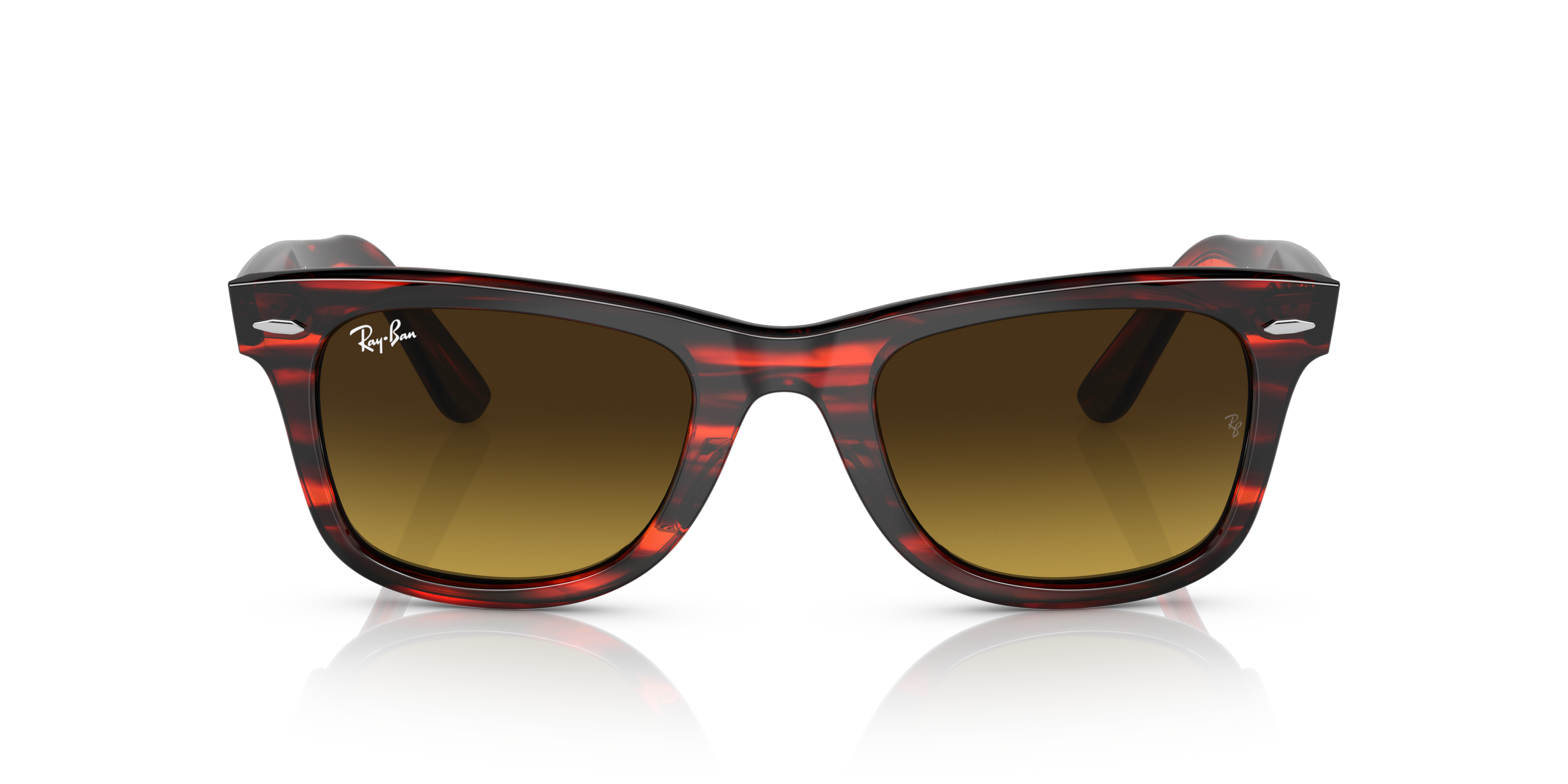 Experience the perfect blend of style and comfort with Ray-Ban Original Wayfarer Bio-Acetate sunglasses. These square-shaped frames are crafted from durable acetate, and polished to a high shine for a luxurious look. The striped red frame color adds a pop of color to your everyday style, while the brown gradient lenses provide optimal clarity in any light condition. These glasses are not only stylish but also practical. Available with prescription lenses.