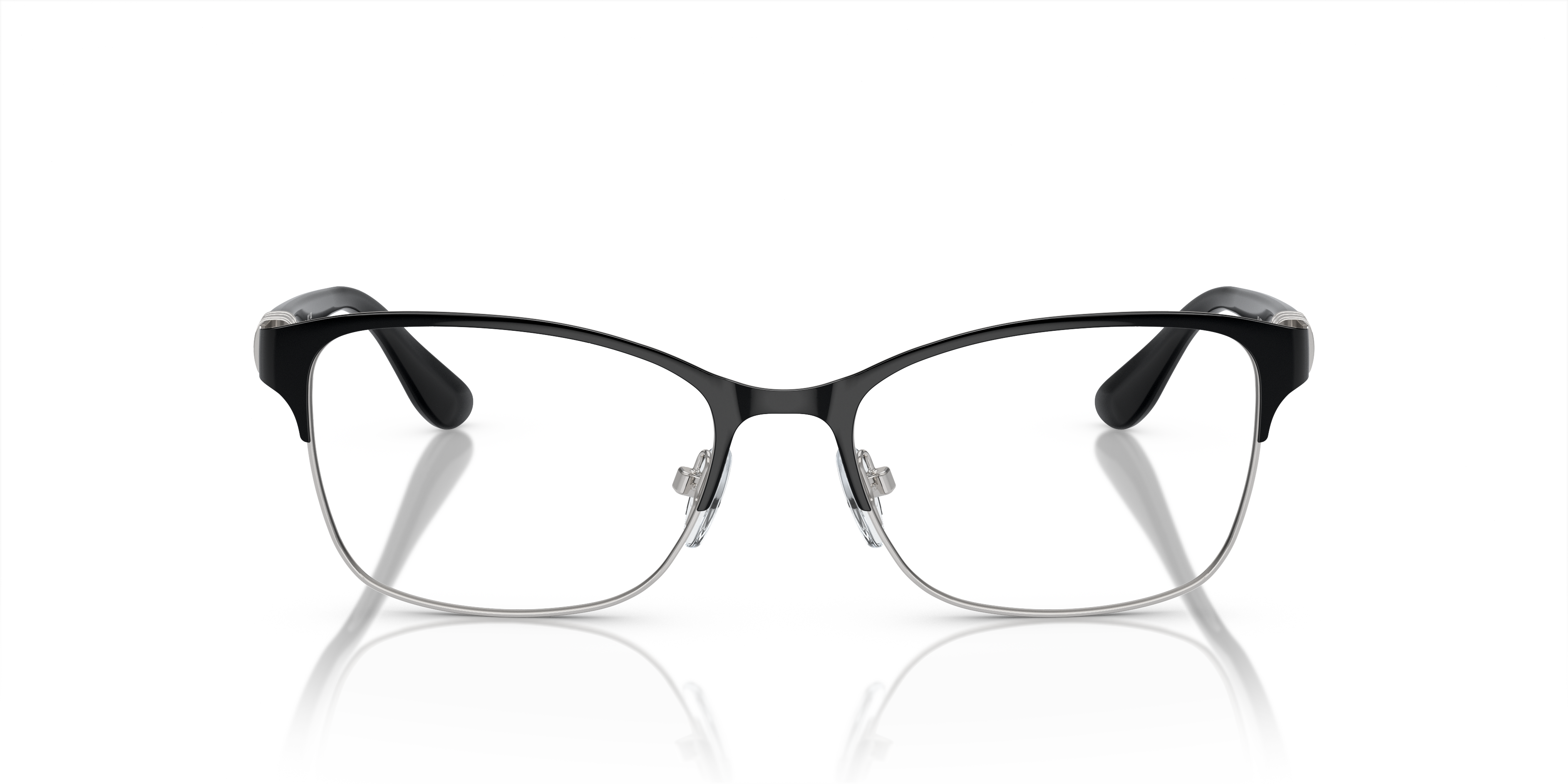 Elevate your fashion standards with Vogue Eyewear VO4050. The polished metal frame in a unique pillow shape offers a modern twist on a timeless design. The top black/silver color adds a touch of sophistication, while the saddle bridge ensures comfort and stability. These eyeglasses are not only stylish but also practical. Embrace your individuality with this eyewear from Vogue Eyewear. Available with prescription lenses.